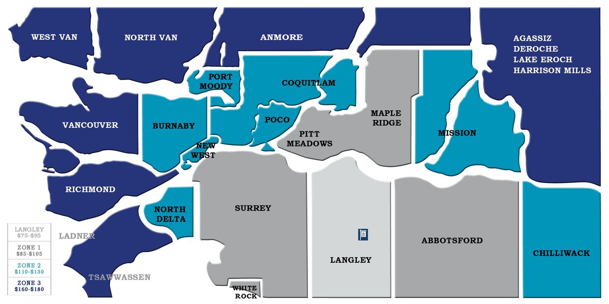 Port Coquitlam, Port Moody, Coquitlam, Burnaby, New Westminster, North Delta, Anmore, Belcarra, Ladner, Tsawwassen, Vancouver, North Vancouver, West Vancouver, Richmond